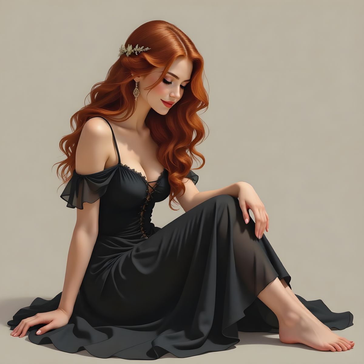 A striking picture of a seated Norse goddess with auburn hair. She is wearing a short dress and is barefoot in this ethereal fantasy scene rendered in a soft, natural style.
