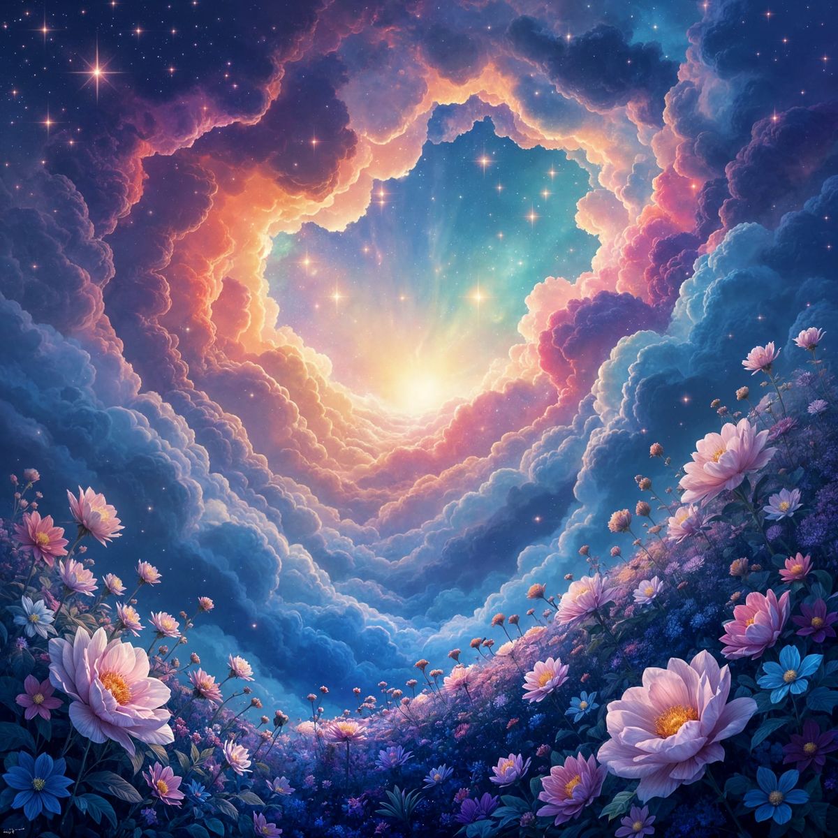 This image shows a majestic nebula shaped like an enchanted garden, filled with crystalline flowers and luminous flora. It captures a dreamlike, ethereal glow.