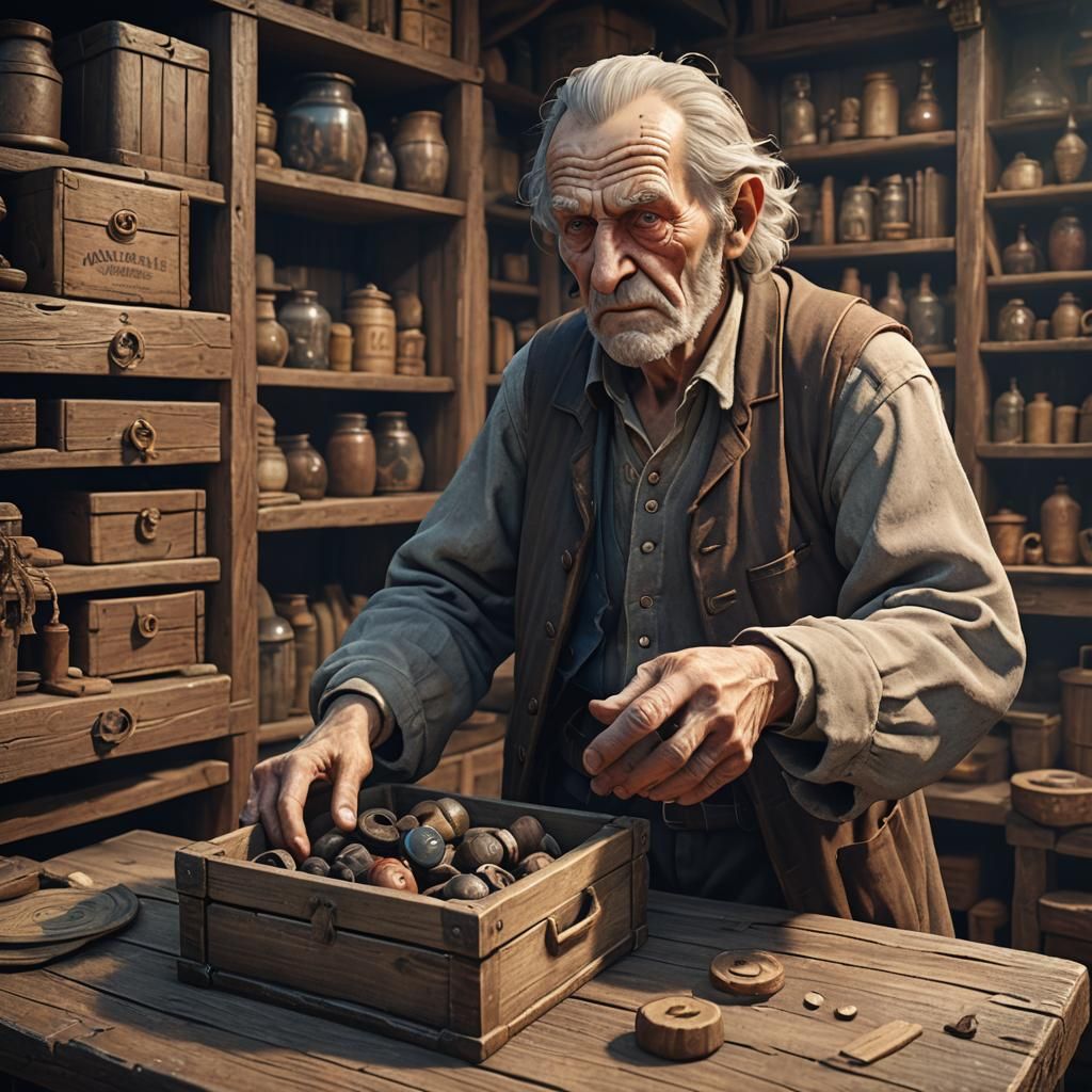 This image shows a wizened old man in an antique store holding out a wooden container. The scene has a detailed 3D rendered aesthetic.