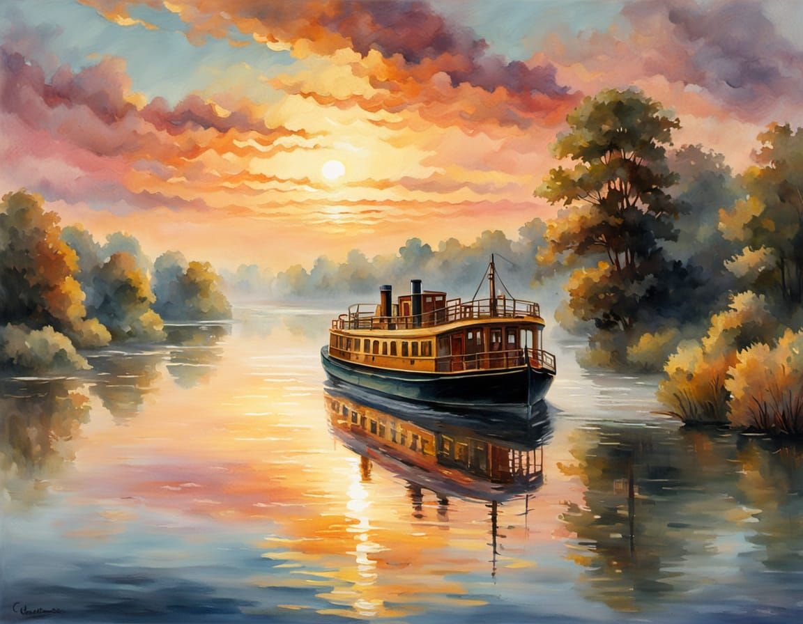 A serene and captivating landscape painting featuring a sternwheeler boat sailing into the early sunrise, surrounded by soft mist, luminous clouds, and warm golden light reflecting off the water, created in the impressionist style with watercolor texture and soft brushstrokes.