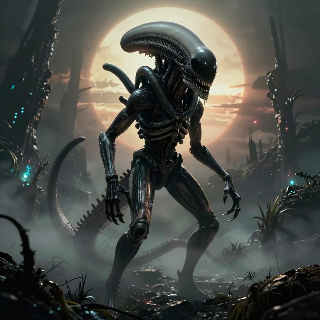This image shows a terrifyingly grotesque Xenomorph from Alien Covenant on a desolate alien planet. The scene is rendered in a dark, gritty, hyperrealistic style with dramatic lighting and atmospheric effects.