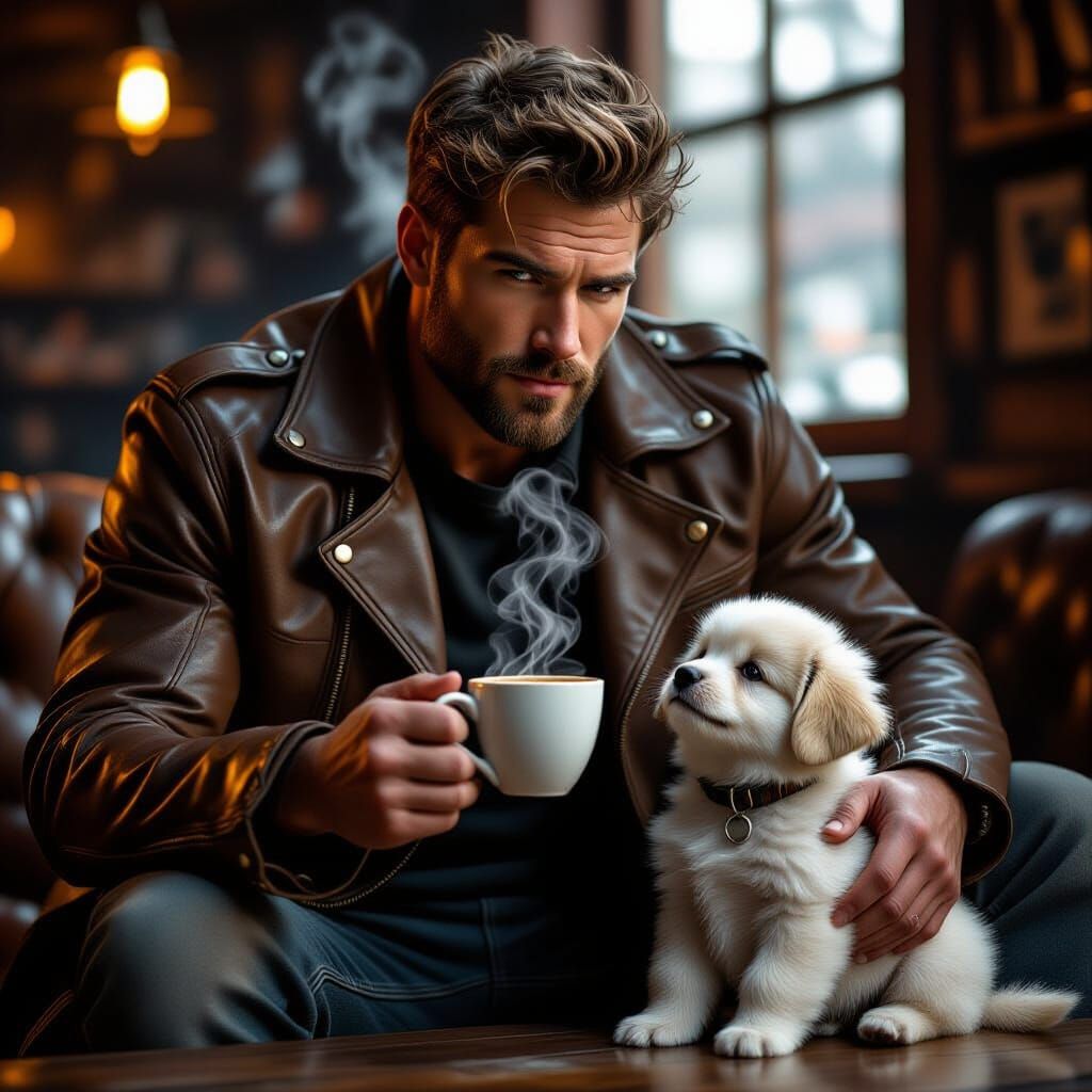 This image shows a rugged man in a leather jacket holding coffee, with a fluffy puppy at his feet. The cozy, ultra-realistic scene blends masculine energy with innocence.
