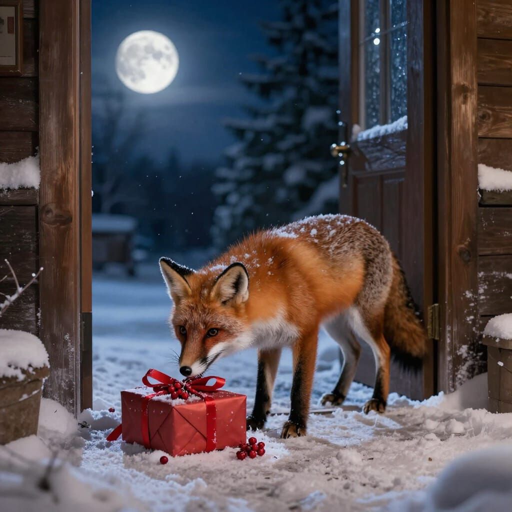 This image shows a wild fox leaving red berries on the doorstep of a snow-covered cottage on a moonlit winter night, rendered in a magical realism style.