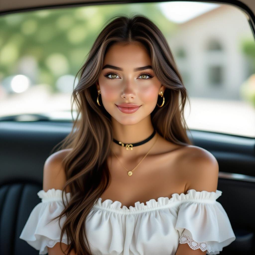 This image shows a young woman with dark hair and light eyes, smiling gently. She wears a white top with lace details and delicate jewelry, illuminated by soft daylight in an art nouveau style.