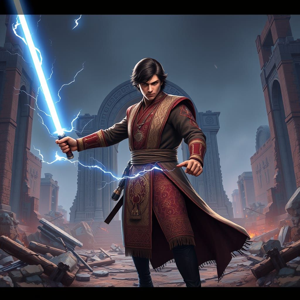 This image shows Ben Solo in traditional Indian attire amidst the ruins of a Jedi Academy, unleashing force lightning. The image blends Mithila patterns with anime-esque force effects in a 3D anime art style.