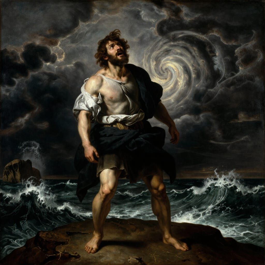 This image depicts a man on a cliff facing a turbulent sea, rendered with dramatic chiaroscuro lighting reminiscent of Renaissance tragedy paintings. Deep shadows and intense highlights enhance the epic, somber mood.