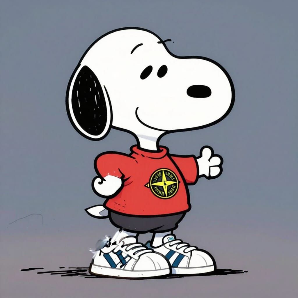 This image features Snoopy in a dynamic pose, sporting Adidas Campus 00 sneakers and a Stone Island t-shirt. Rendered in a modern animation style with clean lines and expressive shading.