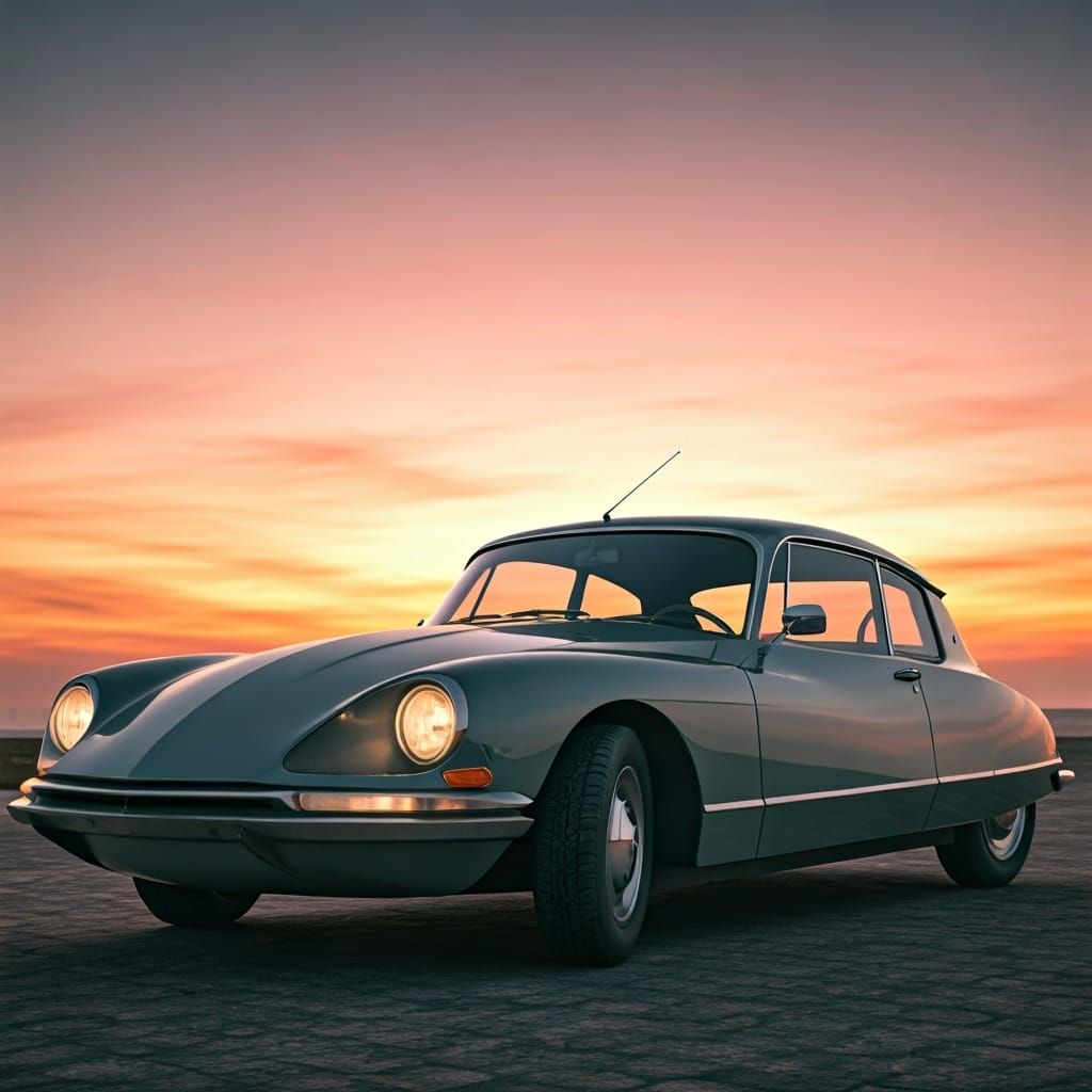 This image shows a pristine silver Citroen coupe against a vibrant sunset backdrop. The classic car's chrome bumper shines, enhanced by volumetric lighting and hyperdetailed textures, in a retro science fiction aesthetic.