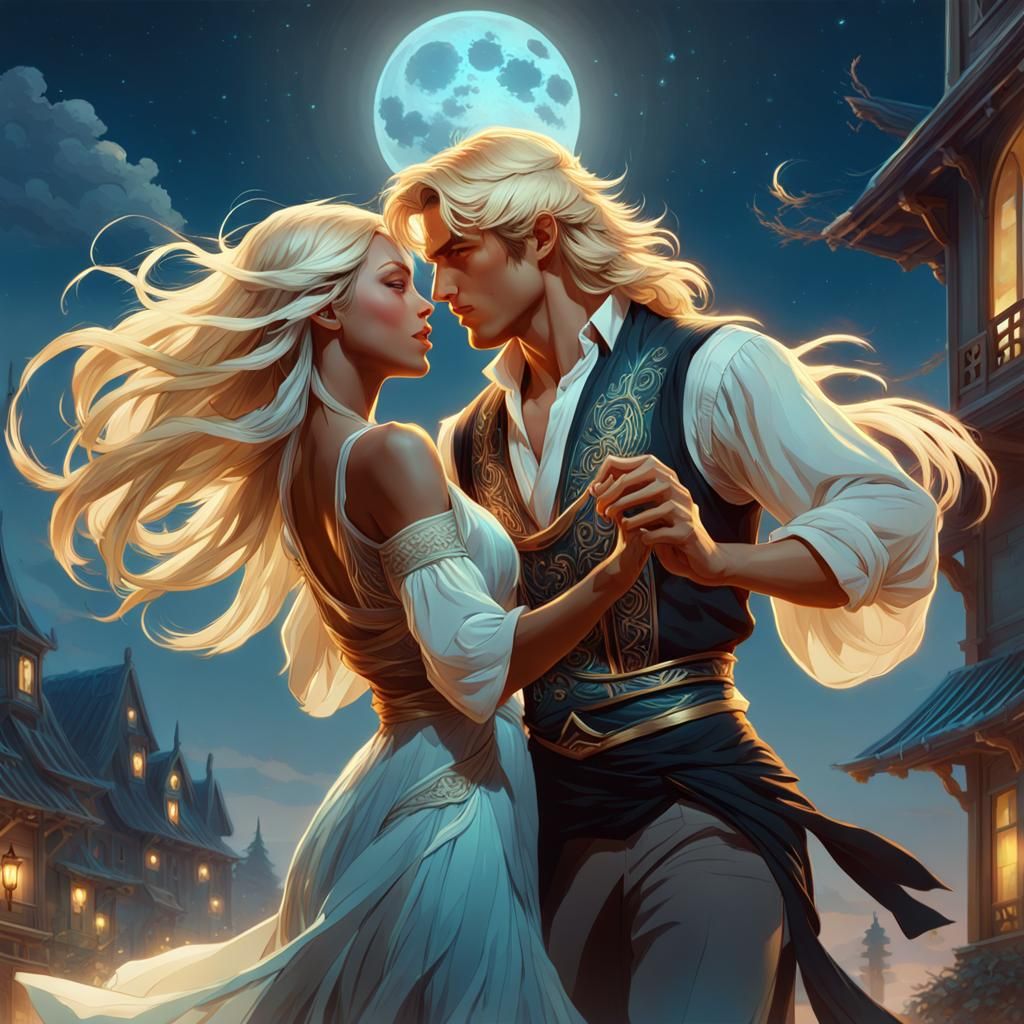 This image shows a blonde boy dancing with a dark-haired girl under the moonlight. The portrait features dynamic lighting and intricate details in a splash art style.