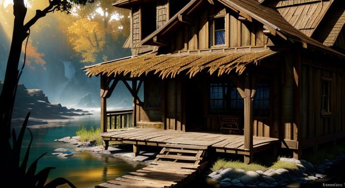 This image shows a large dog resting on a shack porch along a riverbank. The artwork features rich textures, vibrant foliage, and golden hour lighting in an alcohol ink style.