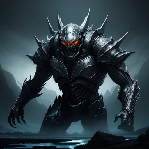 This hyperrealistic digital painting shows a fearsome silver monster with glowing eyes in a desolate, alien world. It features intricate details and dramatic lighting with blues and oranges.