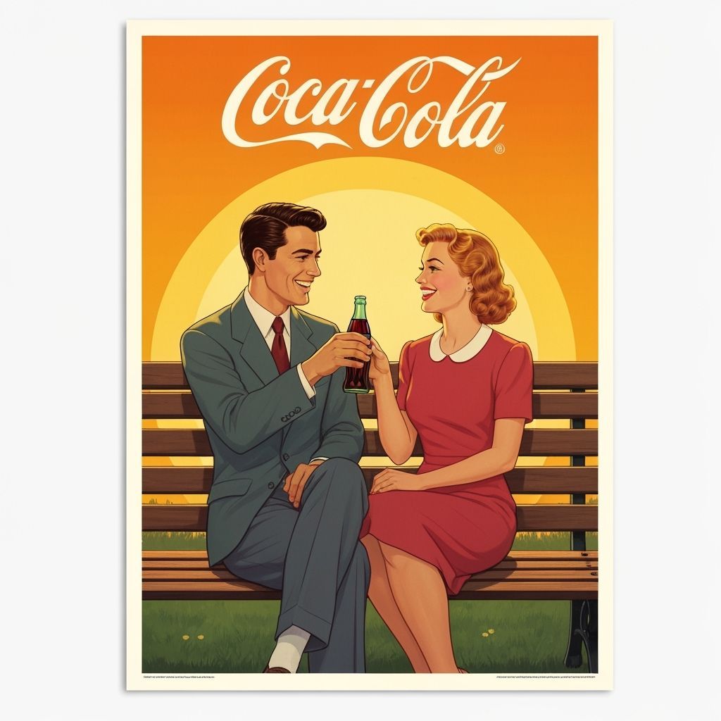 This vintage illustrated poster depicts a happy couple enjoying Coca-Cola in a park. Features solid, vibrant colors and a warm, inviting glow, inspired by classic graphic design.