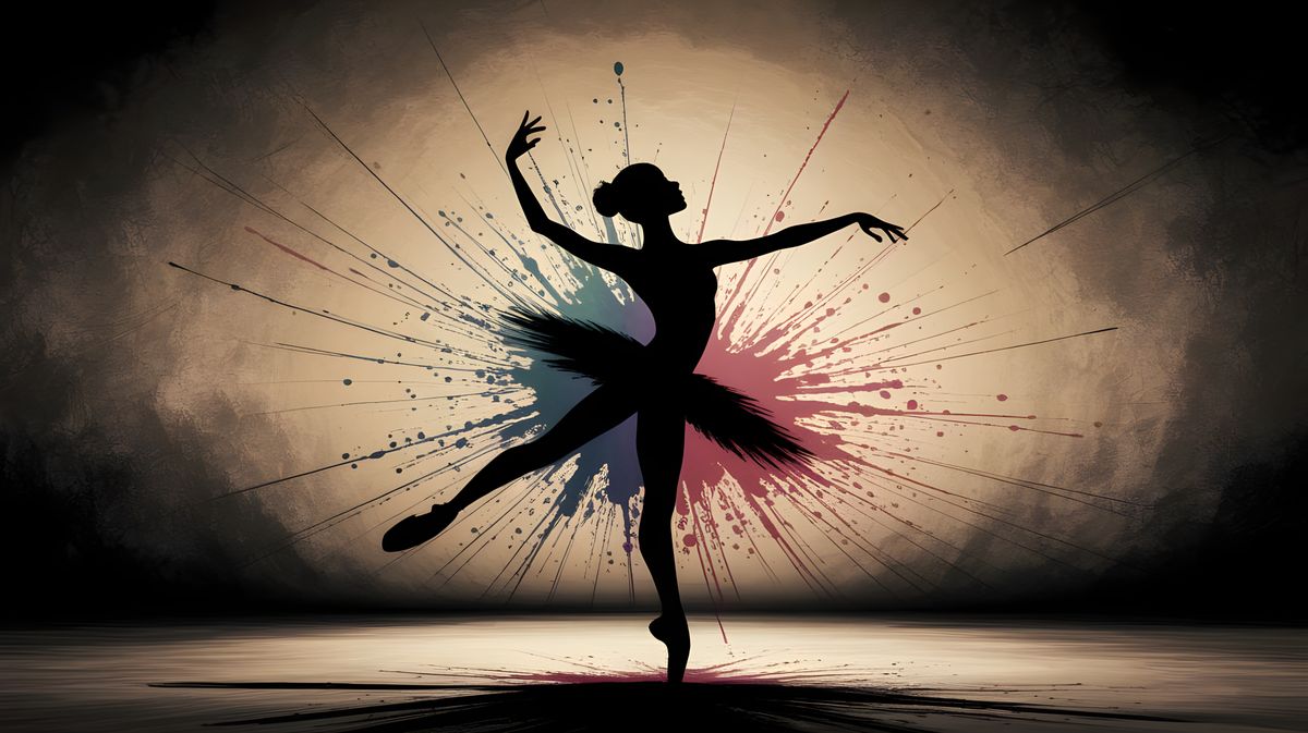 A hyper-detailed colored ink splatter silhouette of a ballet dancer fills a panoramic, massive-scale canvas. Intricate lines and splashes create a dramatic, epic scene with god-like lighting that casts volumetric shadows and highlights, giving the image a sense of depth and movement. Warm, volumetric ...
