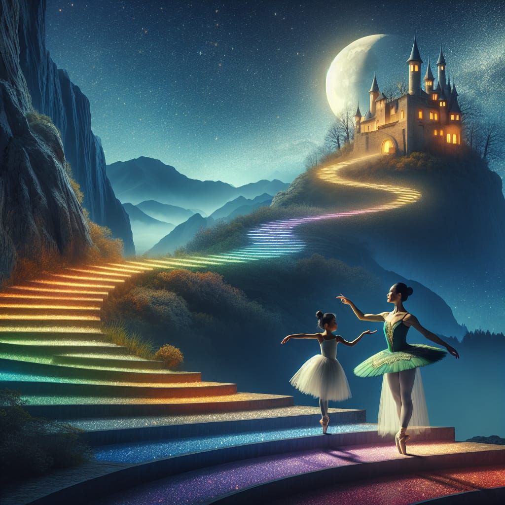 This image shows a serene mountainous landscape with a mystical staircase leading to an enchanting castle. A South Asian ballerina stands at the top, beckoning a Hispanic child to join her in pursuit of artistic dreams.