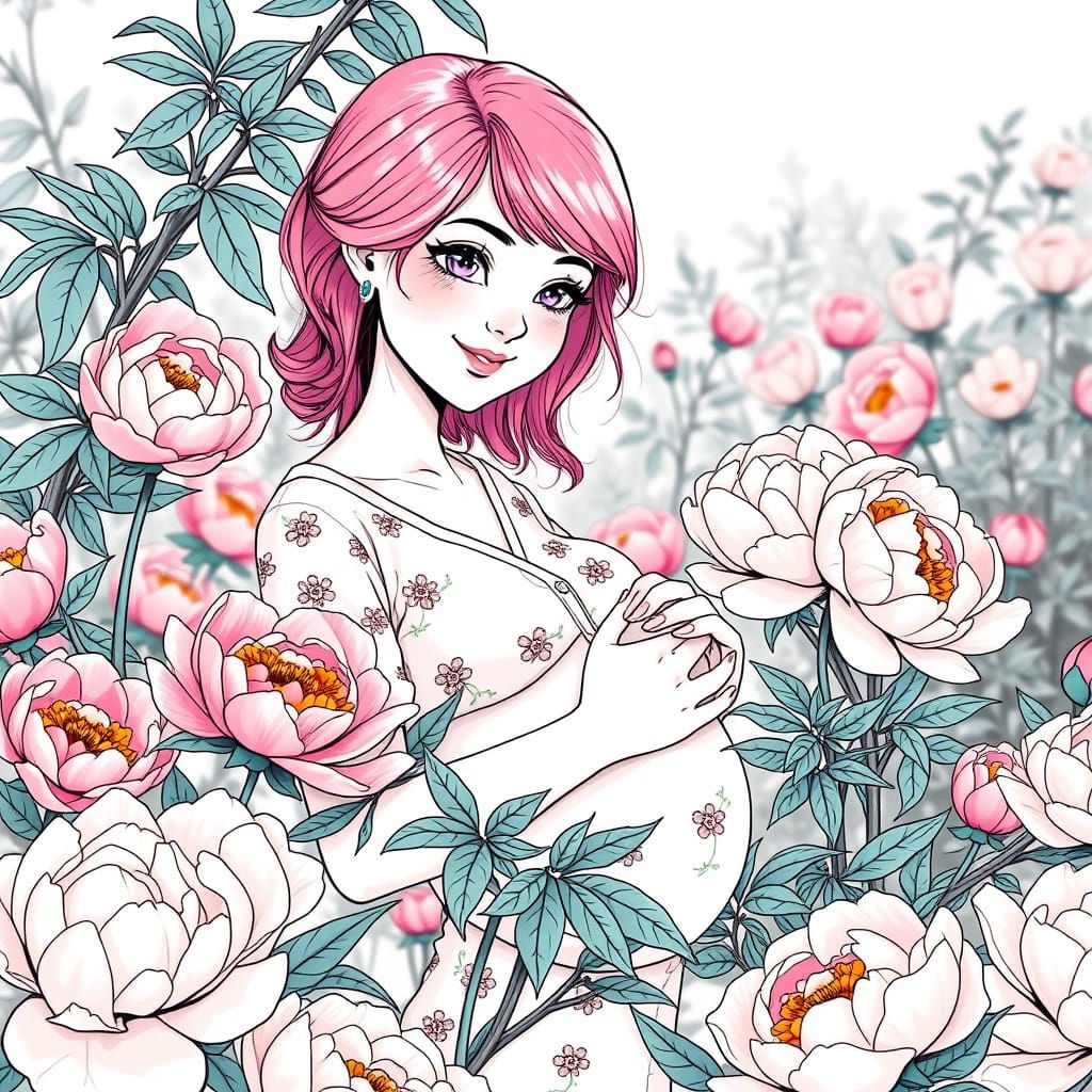 A serene mother in a garden setting, surrounded by lush peonies and delicate details, with vibrant accents and soft, dreamy atmosphere, reminiscent of elegant illustrations and concept art.