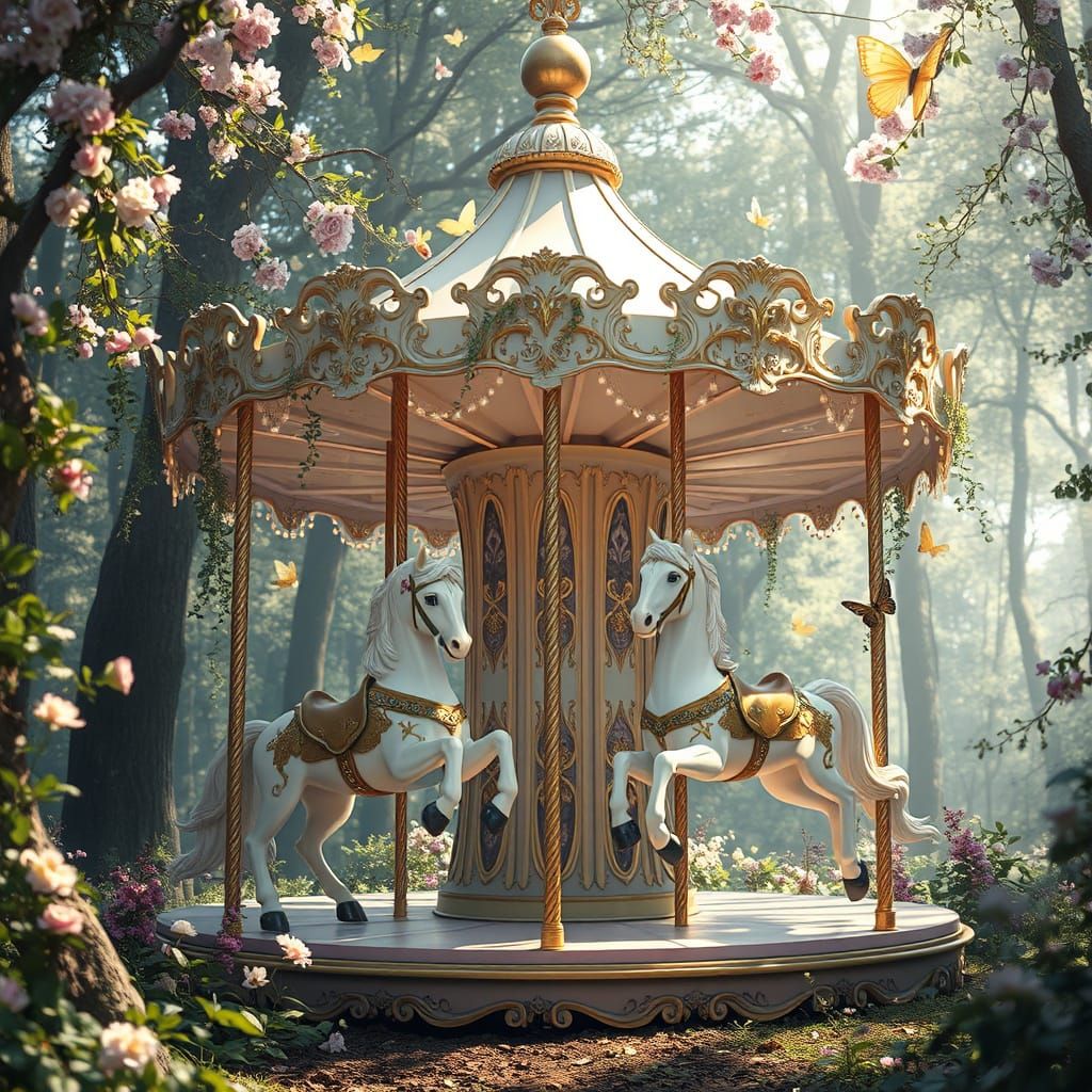 A dreamy, fairytale carousel in a forest clearing, adorned with hanging vines, blooming pastel flowers, and fluttering butterflies. Two white carousel horses with golden saddles, bathed in soft sunlight filtering through the trees. Whimsical and magical atmosphere, like a page from a children’s storybook, ...