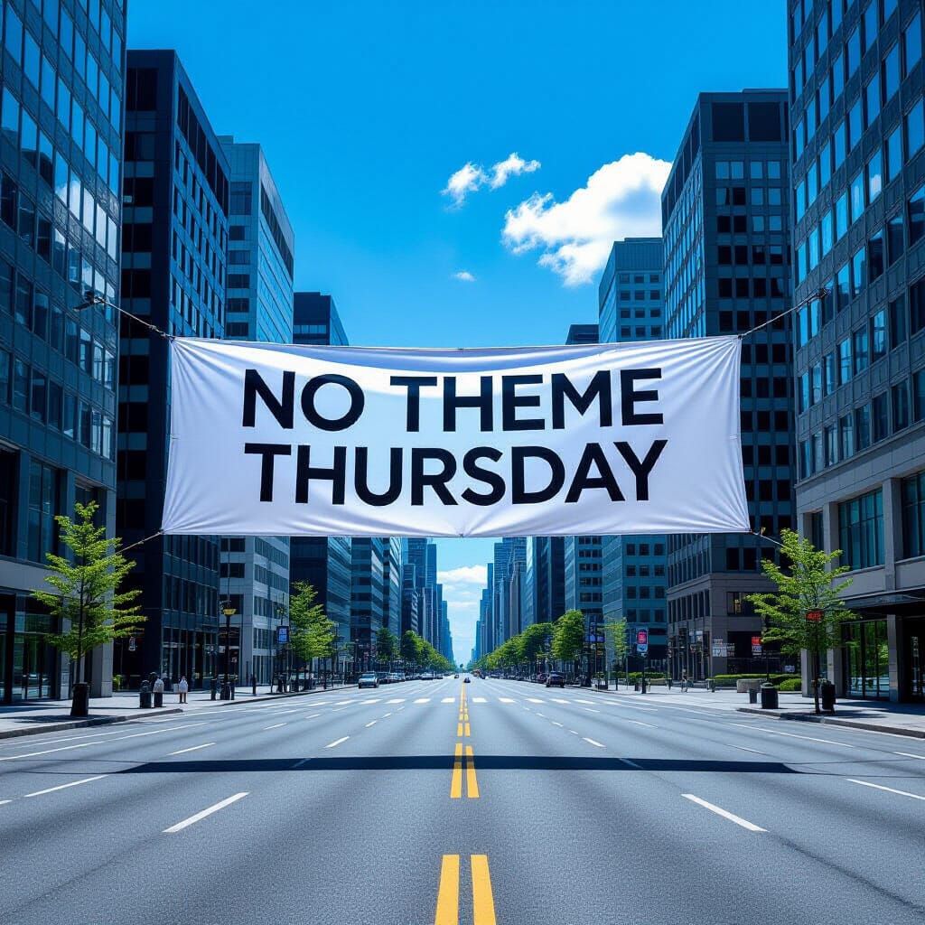 This image shows a deserted city with modern skyscrapers under a bright blue sky. A large banner with the text "NO THEME THURSDAY" floats in the still air. The image has a sharp, high-definition quality achieved through professional photography techniques.