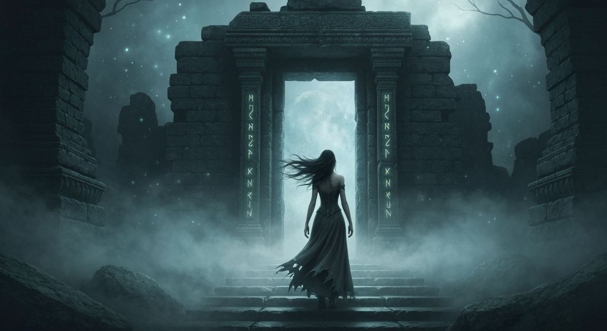 This dark fantasy concept art features a lone woman in a gothic gown before a misty, crumbling temple. Ethereal moonlight reveals glowing runes, creating a mysterious and powerful scene.