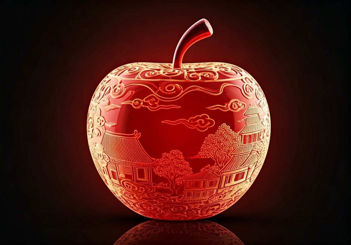 A striking picture of a village inside a glass apple. The blood-red and gold gradient colors create a sense of warmth, while the auspicious cloud pattern adds an element of mystique. The art is embossed.