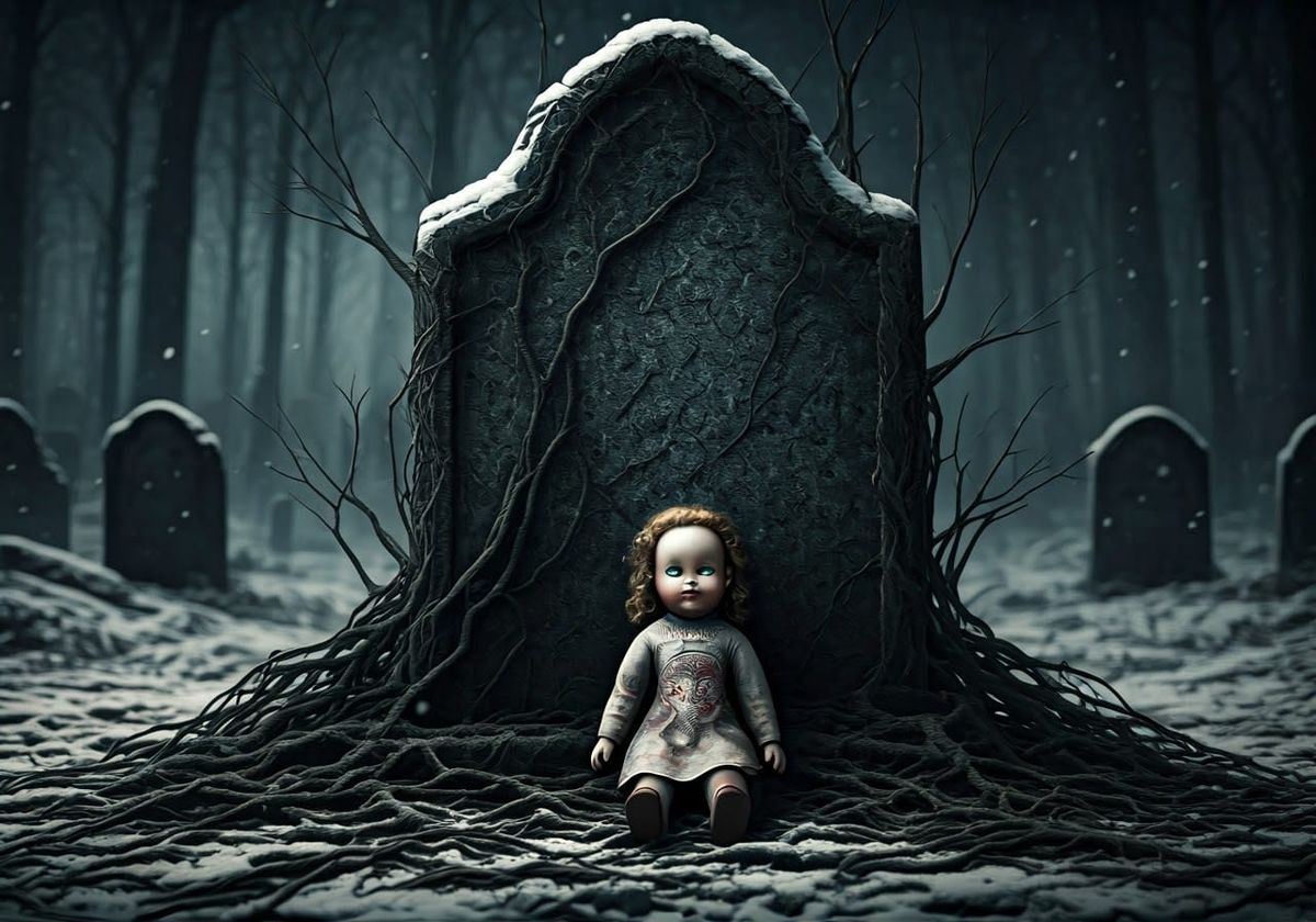 This image shows a hyper-realistic digital rendering of a creepy China doll with glass eyes posed against a gravestone. The doll is set against a dark, chaotic fantasy backdrop with red snow.