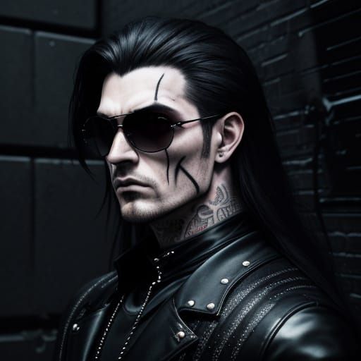 A close-up of a demonic male with long red hair and tattoos, wearing silver mirrored sunglasses and a black leather outfit, set against a dimly lit alleyway with shattered glass and graffiti-covered walls, reflecting the faint moonlight in a moody, high-contrast scene