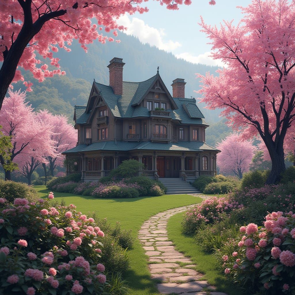 A vibrant home nestled amongst rolling hills and cherry blossoms. The scene is illuminated with cinematic lighting in a meticulously crafted digital matte painting.