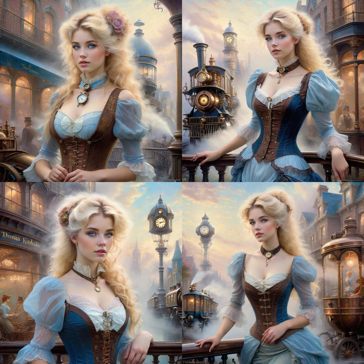 This image shows ethereal young women in Belle Epoque attire within a steampunk setting. The soft colors and textures evoke a hyperdetailed, dreamy atmosphere.