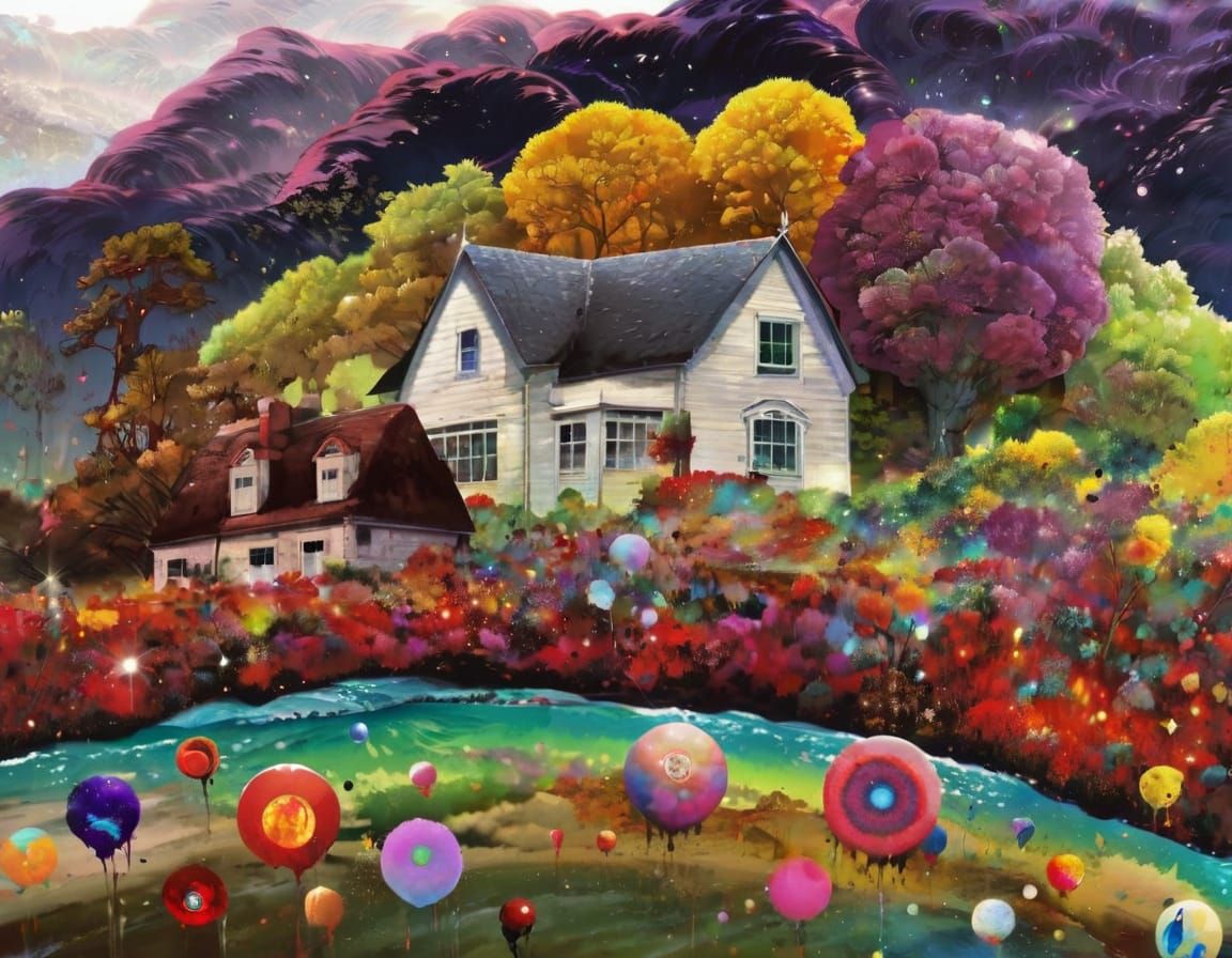 This image shows a highly detailed digital illustration with liquid ink and watercolor effects. It features dramatic natural lighting, vibrant colors, and a bokeh effect, reminiscent of early 20th-century decorative painting.