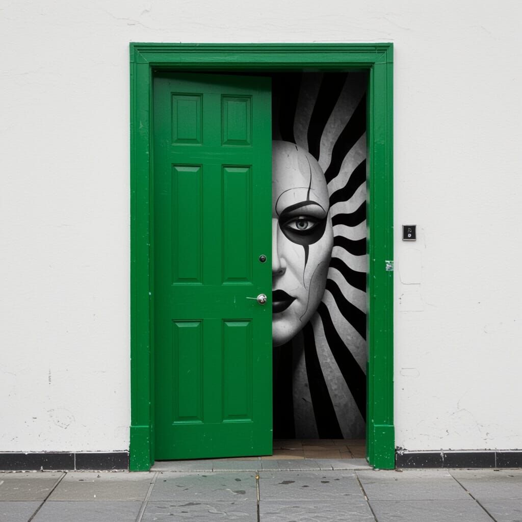 This image captures the essence of mystery surrounding a green door, hinting at strange music and unseen secrets within. It evokes a sense of intrigue and the unknown.