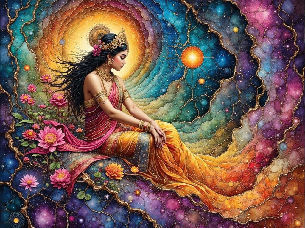 A vibrant image of a reclining Indian goddess wearing a patterned sari and symbolic jewelry. The goddess is set against a swirling, hyper-dimensional backdrop, realized as psychedelic digital art.
