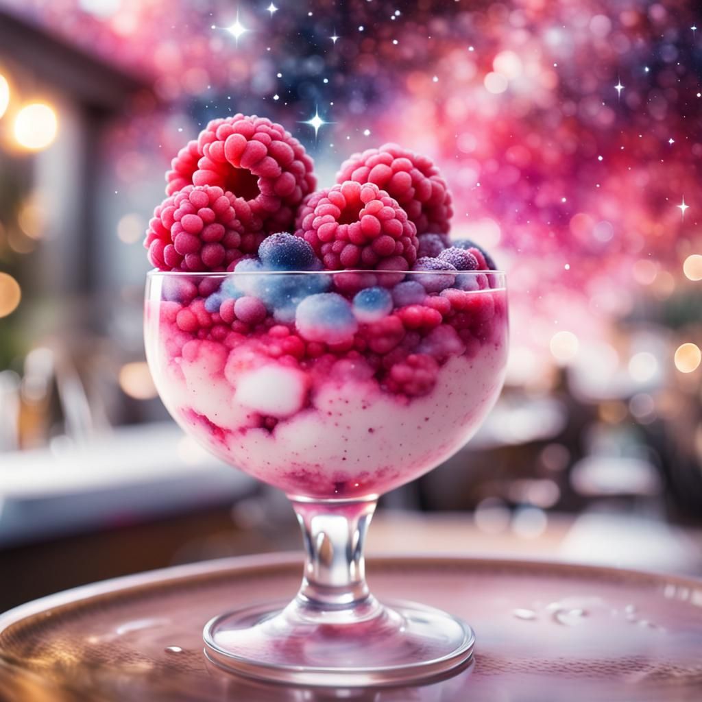 A watercolor illustration of raspberry iced mousse set against a blurred restaurant backdrop and overlaid with a galaxy nebula in double exposure with a bokeh effect.