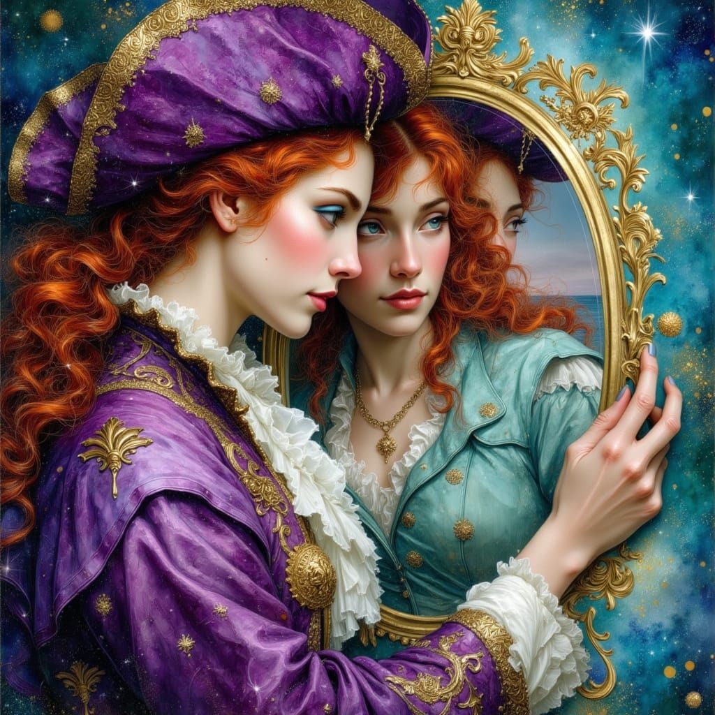 A striking picture of a pirate king and queen in colorful attire. The pair are touching a mirrored reflection, set against a seashore and outer space backdrop in a dark fantasy aesthetic.