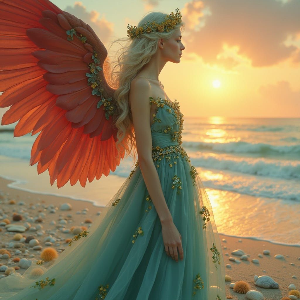 This serene angelic figure stands on a beach at sunset, surrounded by shells and vibrant colors, wearing a Victorian-inspired blue gown with yellow roses and majestic red wings, evoking the dreamy landscapes of Pre-Raphaelite art and fantasy worlds.