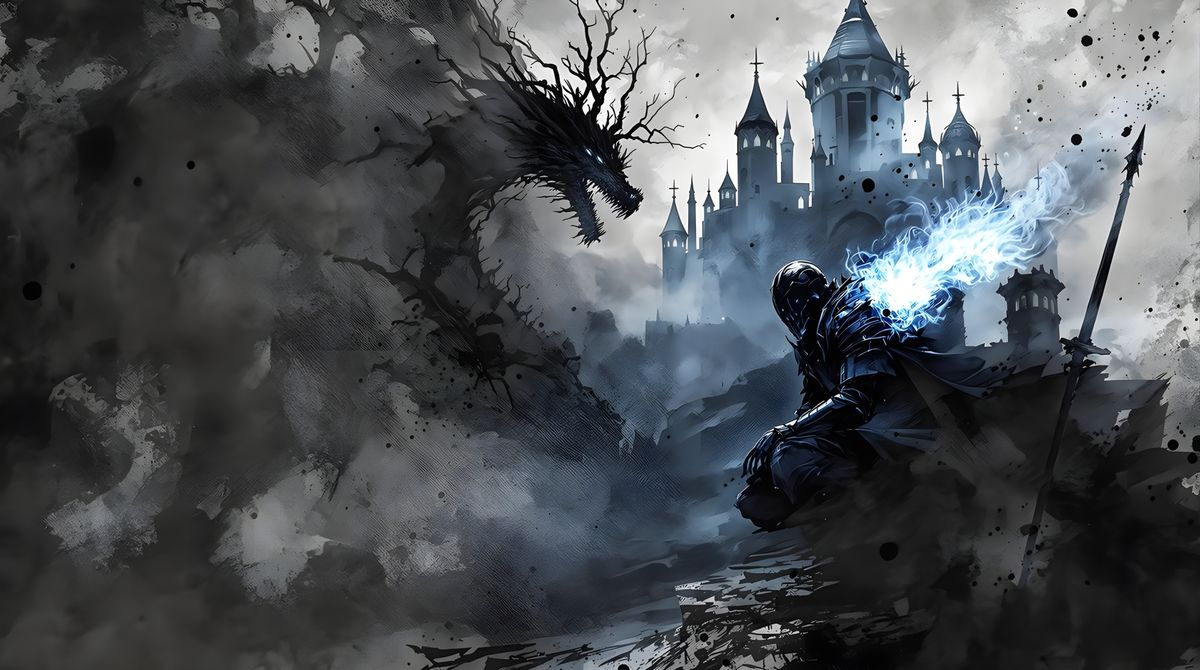 This image is a dramatic, textured double exposure blending a Gothic knight, a fortress, and a spectral dragon, rendered in an impressionistic style with heavy brushwork and ink effects. A stormy atmosphere is suggested by the chaotic, shadowy background and ethereal fire.