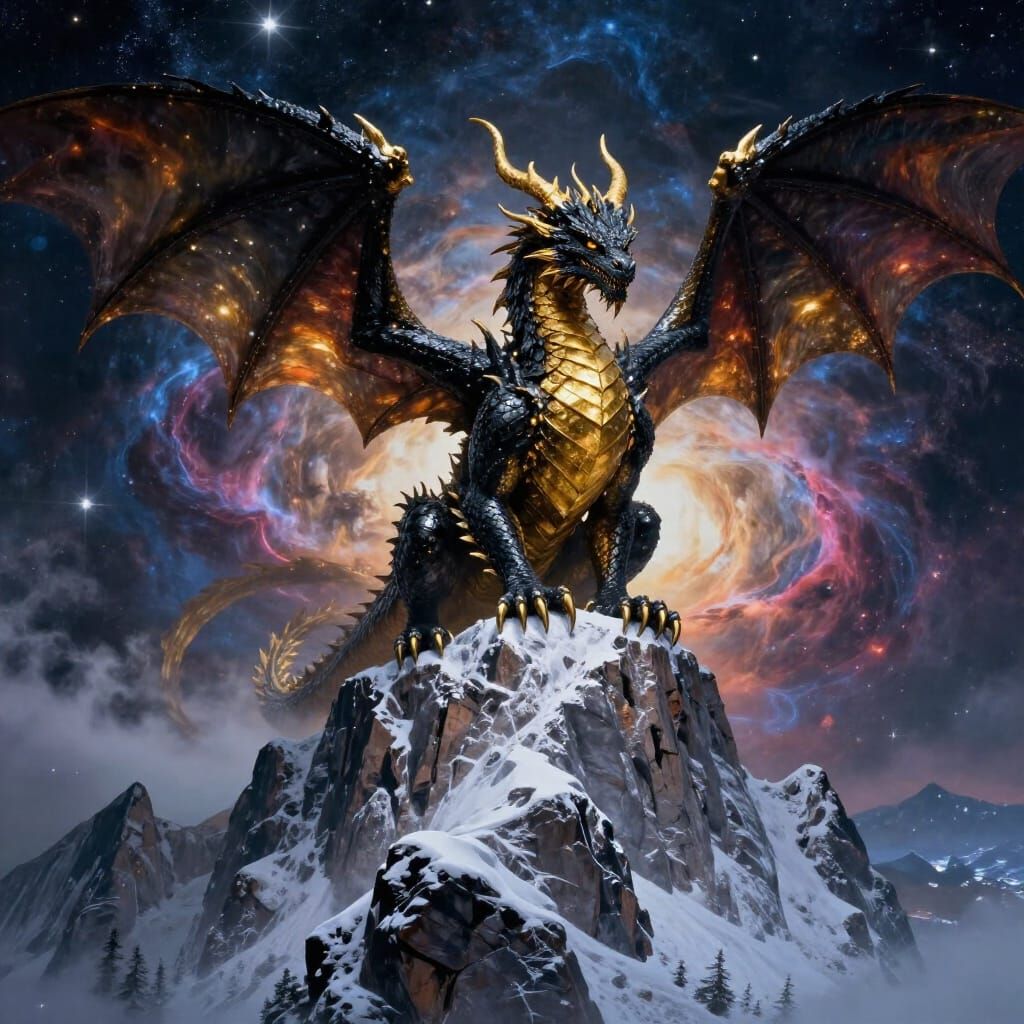 This image showcases an ancient dragon with obsidian scales and golden eyes, resting on a snowy mountain. The background features a vibrant, cosmic nebula, rendered in a hyperrealistic fantasy art style with dramatic lighting.