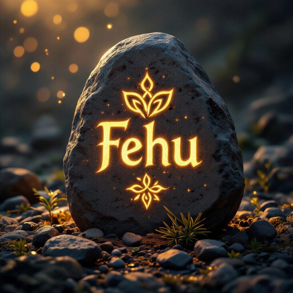 This image shows a Fehu rune carved into rustic stone, bathed in soft golden light. It is surrounded by symbols of wealth and abundance with a mystical, ethereal background and bright particles. Rendered in a realistic style with textured details.