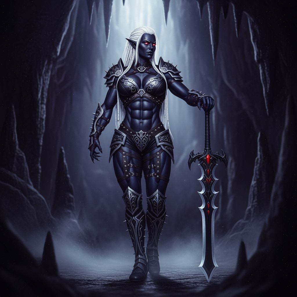 This image shows a powerfully built female drow warrior in dark, form-fitting leather armor, holding an ornate greatsword. The scene features dramatic cinematic lighting and a moody color palette, with a subtle film grain effect.