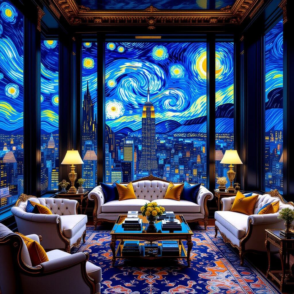 Design your own stunning maximalist interiors, inspired by New York penthouses and Van Gogh. Free and easy AI image generation.