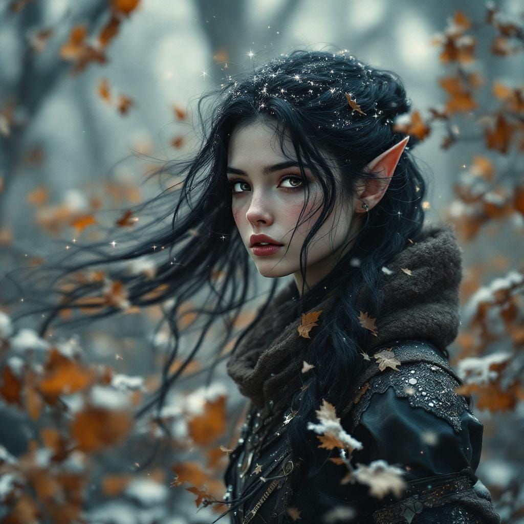 A celestial elven huntress drifts in a sea of light and leaves. This image evokes a sense of wonder with futuristic landscapes and intricate details in a hyperrealistic style.