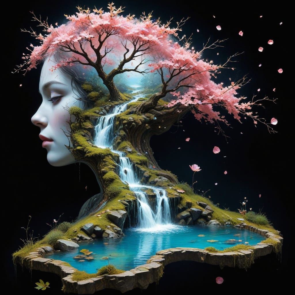 This image showcases a striking double exposure of a woman's silhouette holding an umbra against a black background, with vibrant seasons intricately composed within. Featuring Sakura trees, crystal blue ponds, and dynamic lighting, this digital art piece blends realism with hyperrealistic details and fi...