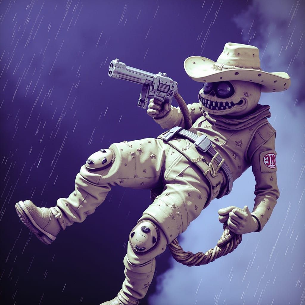 This detailed digital illustration depicts a quirky, star-shaped cowboy in a desert landscape, presented with a moody, grainy aesthetic. A true masterpiece of concept art.