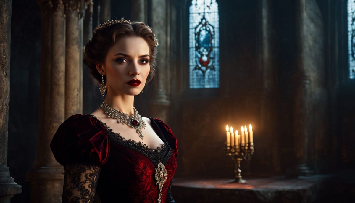 Shrouded in shadows and crowned by firelight, she stands in still command of the ancient hall. Her dark velvet gown flows like spilled wine, and her blood-red lips hint at secrets whispered under moonlight. The glint of her fangs—barely visible beneath her composed expression—confirms what the legends warned: this is no ordinary woman. She is a vampire of noble blood, timeless and dangerous, draped in elegance and cloaked in centuries of hunger. The flickering candlelight dances across the stone walls behind her, but nothing outshines the chill in her gaze. She is both royalty and predator—immortal, untouchable, unforgettable.