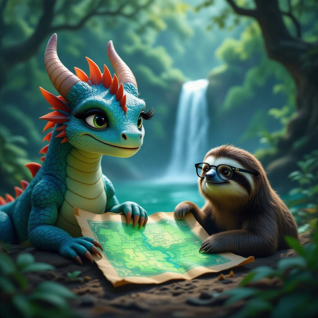 This cinematic image depicts a vibrant female dragon and a bespectacled sloth starting an adventure. They follow a glowing map through a forest towards a magical emerald waterfall. Shot with film grain and dramatic lighting.
