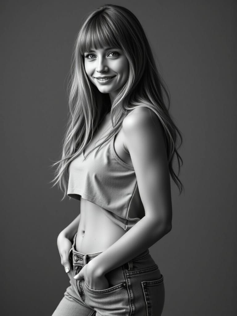 This image is a hyper-realistic black and white portrait of a young woman with long, wavy hair and a warm smile, showcasing her beauty in a candid, everyday moment.