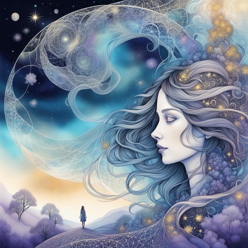 This image shows a medium shot of a girl merging with their mother. Set against an ethereal constellation sky, the digital art features golden and neon accents, intricate detail, and soft, creamy whites.