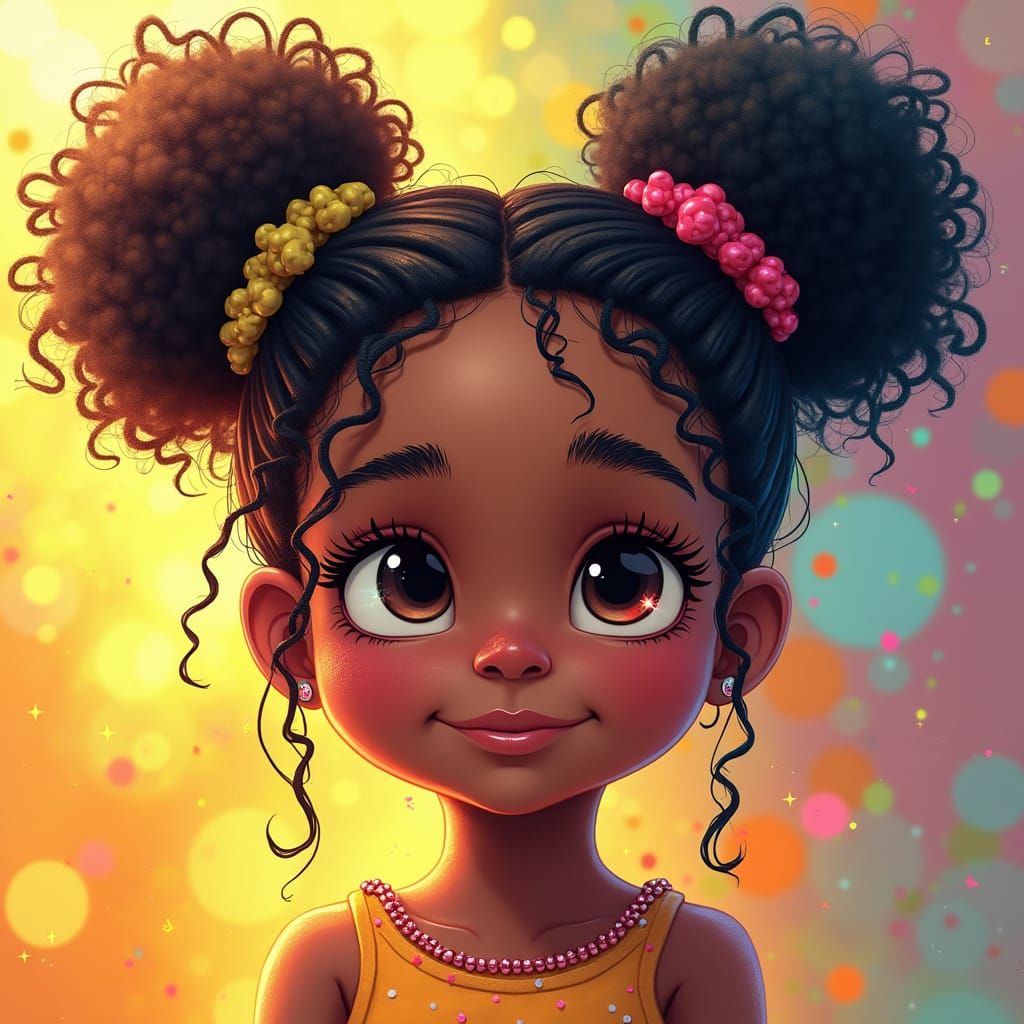 This image shows a bright and cheerful 5-year-old girl with a colorful afro in a lively environment, adorned with colorful ribbons in her two braids, wearing a happy outfit and smiling. The artwork combines pastel colors, delicate details, and a touch of surrealism, evoking a sense of movement and innoce...