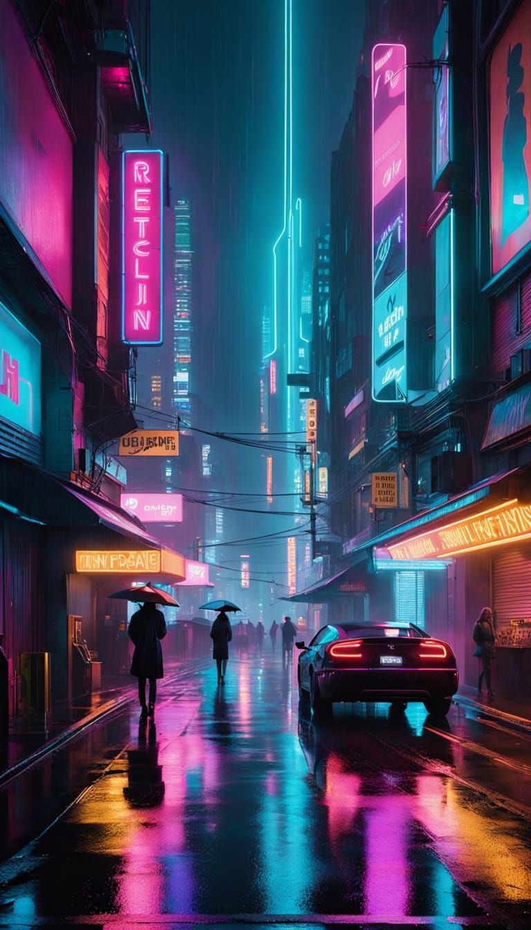 This image captures a vibrant city scene at night, with neon lights reflecting off wet pavement and diverse, futuristic buildings creating a sense of depth and mystery