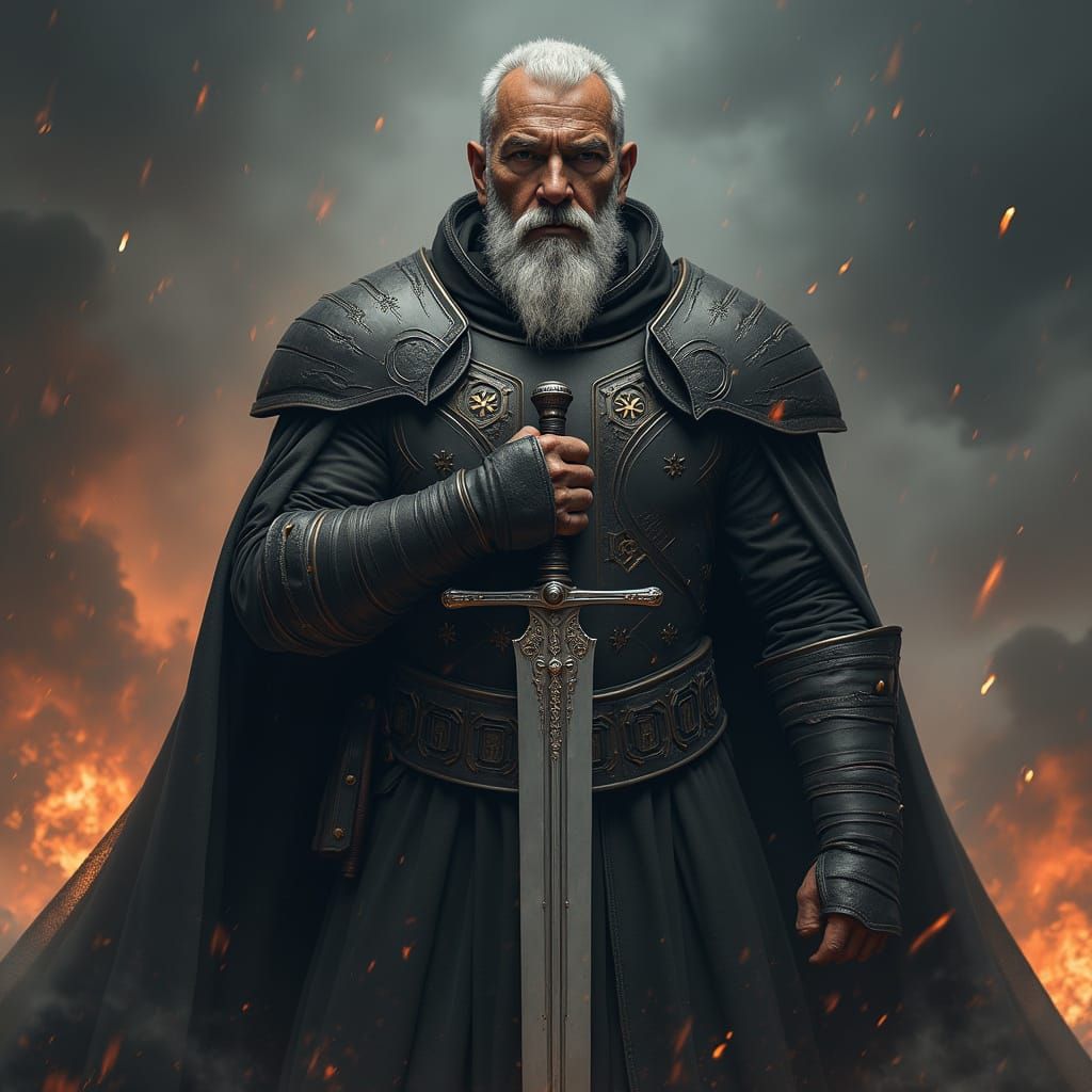 A majestic, battle-hardened warrior stands tall, exuding calm and command. He wears dark armor adorned with glowing symbols and holds a massive silver sword, set against a stormy background ablaze with light and heat distortion.