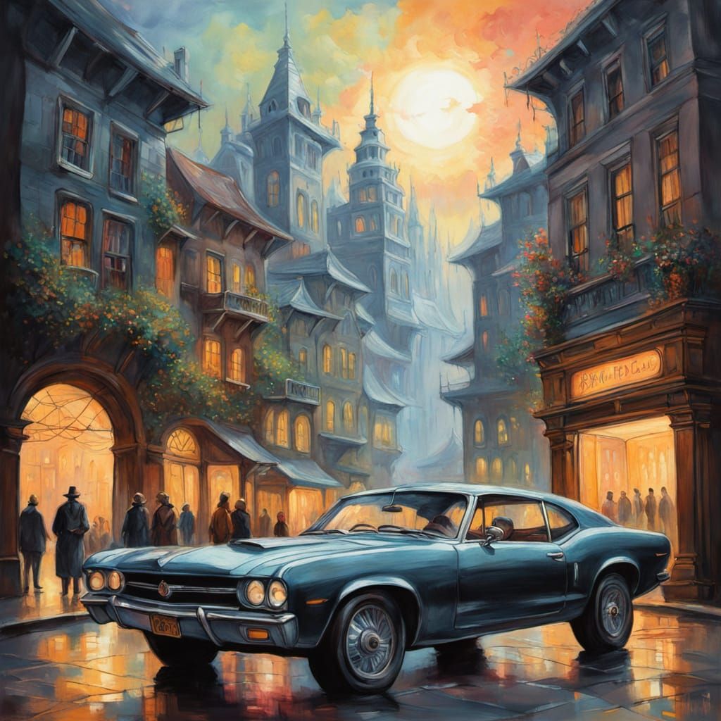 A vibrant gouache painting of a quirky, cartoon-style car with oversized wheels hovering above a neon-lit city. Radiant gradients and soft pastel hues create an ethereal, enchanted feel.
