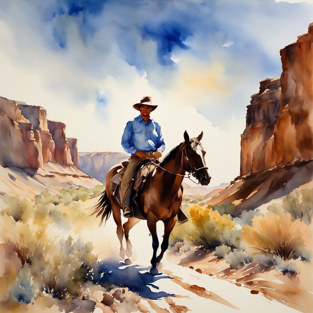 This image shows a cowboy on horseback riding through a desert canyon. The artwork employs impressionistic watercolor techniques with a wet wash, capturing the vastness of the desert landscape.